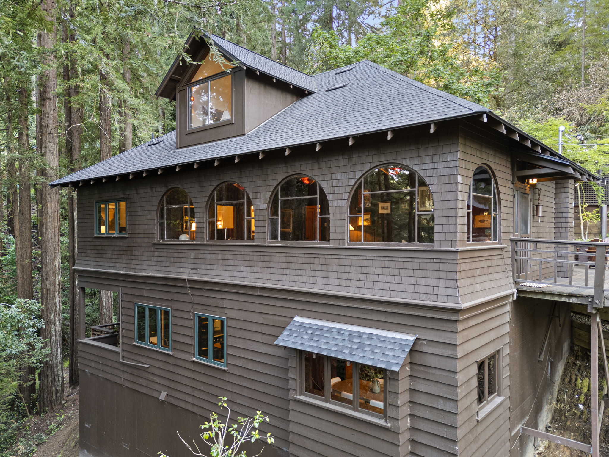 From the moment you enter, the home reveals itself with quiet confidence: richly patinated woodwork, hand-crafted details, and original fixtures that speak to an era when design was as much philosophy as it was form. The living room unfolds as a kind of sanctuary, anchored by a series of striking arched windows, an uncommon and exquisite feature that frame the surrounding redwoods like living artwork. Light filters through in a way that feels almost cinematic, shifting with the day and deepening the home's lodge-like warmth. In the dining room, craftsmanship takes center stage. A built-in bar, intricate stained-glass accents, and meticulously preserved millwork create a setting that feels both intimate and storied.